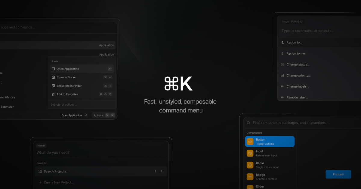 cmdk (short for Command Menu Kit) is a headless React component library that helps you build command menus quickly.